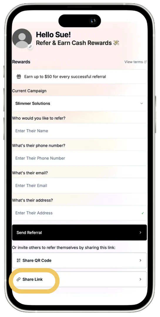 Promoters can send a direct referral or use the "Share Link" feature to send to friends.